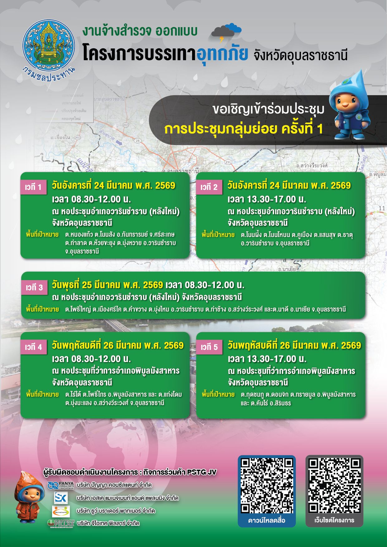เมื่อวันที่ 12-13 มีนาคม พ.ศ. 2569 กิจการร่วมค้า PSTG JV เข้าพบนายอำเภอ ผู้นำชุมชน และสำนักงานชลประทานที่ 7 เพื่อนำเสนอข้อมูลรายละเอียดและแผนการดำเนินงานโครงการ